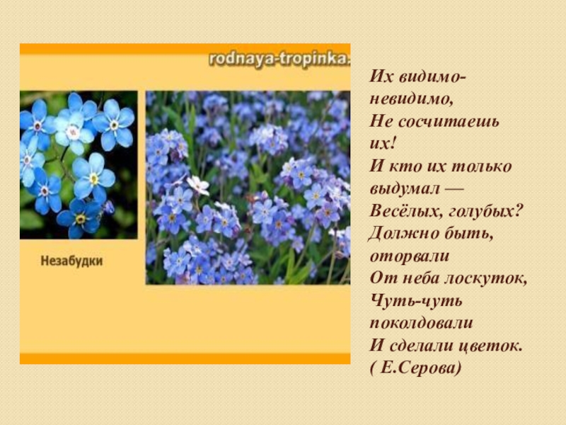 Слайд 11Незабудка цветет очень долго почти до осени. Их много на берегах ручьев.