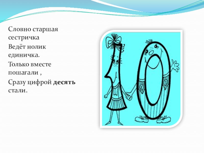 Словно старшая сестричкаВедёт нолик единичка.Только вместе пошагали ,Сразу цифрой десять стали.