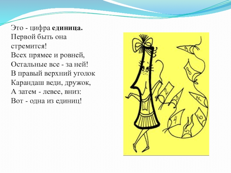 Слайд 2Это - цифра единица. Первой быть она стремится! Всех прямее и ровней, Остальные все
