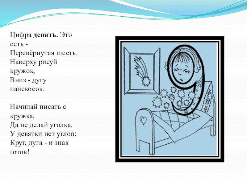 Слайд 10Цифра девять. Это есть - Перевёрнутая шесть. Наверху рисуй кружок, Вниз - дугу наискосок. Начинай