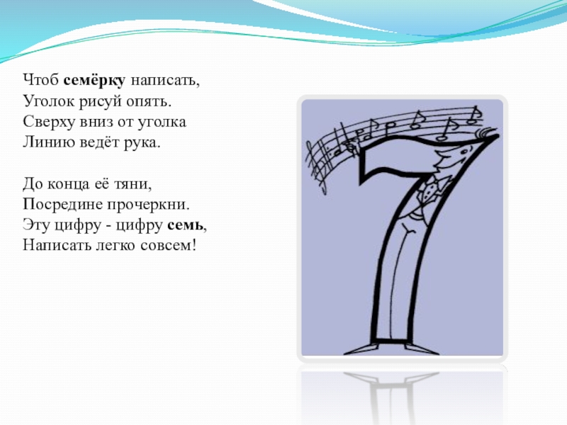 Слайд 8Чтоб семёрку написать, Уголок рисуй опять. Сверху вниз от уголка Линию ведёт рука. До конца