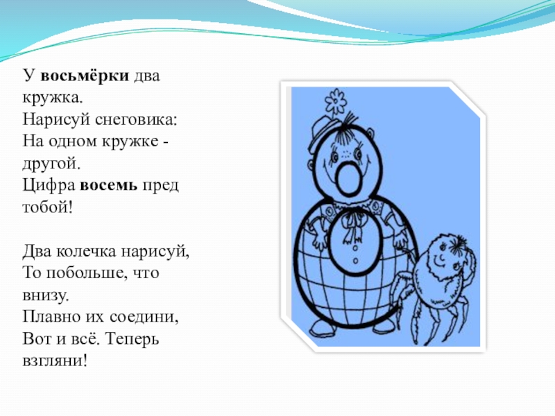 У восьмёрки два кружка. Нарисуй снеговика: На одном кружке - другой. Цифра восемь пред тобой!  Два