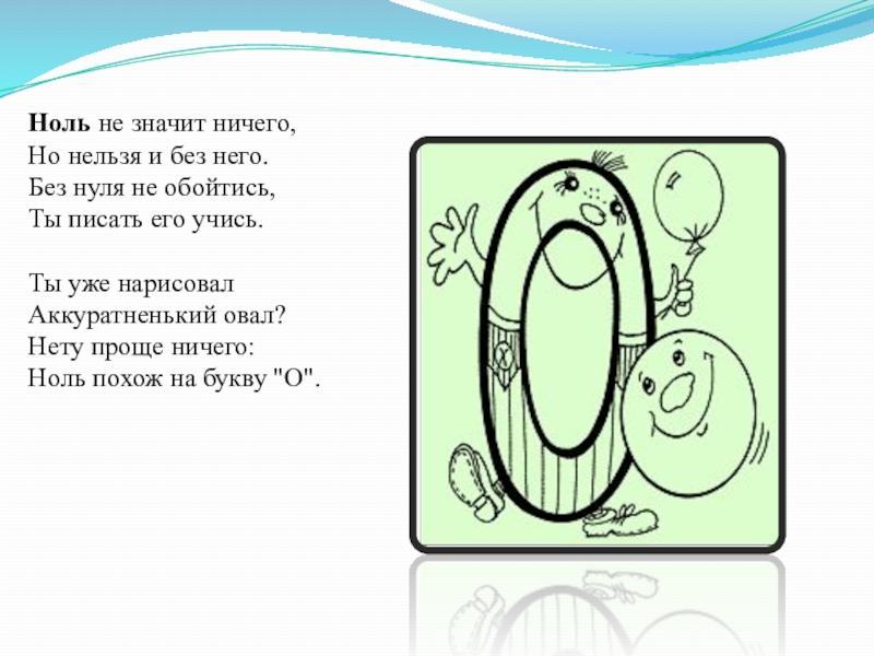 Ноль не значит ничего,  Но нельзя и без него. Без нуля не обойтись, Ты писать его учись.