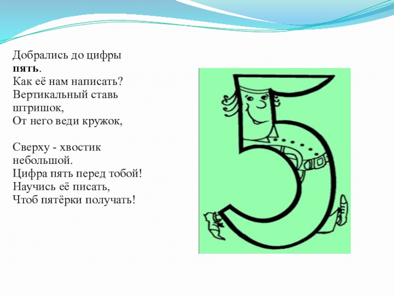 кружок, Сверху - хвостик небольшой. Цифра пять перед тобой! Научись её писать, Чтоб пятёрки получать!