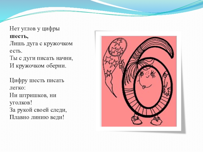 Слайд 7Нет углов у цифры шесть, Лишь дуга с кружочком есть. Ты с дуги