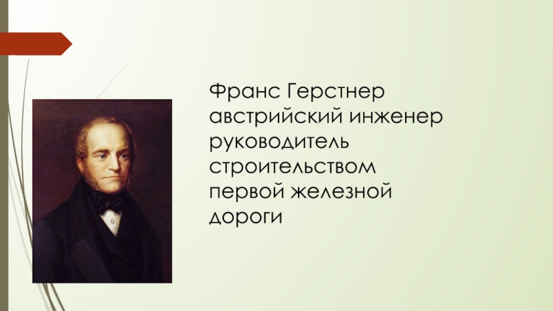 Слайд 3Франс Герстнер австрийский инженер руководитель строительством первой железной дороги