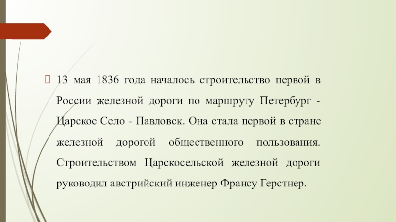 по маршруту Петербург - Царское Село - Павловск. Она стала первой в стране железной дорогой общественного пользования. Строительством Царскосельской железной дороги руководил австрийский инженер Франсу Герстнер.