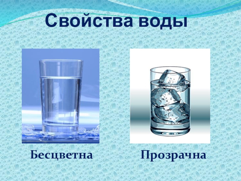 Свойства воды   Бесцветна        Прозрачна