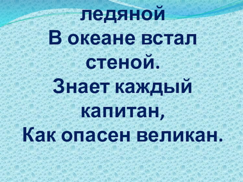 Слайд 25Белой глыбой ледяной В океане встал стеной. Знает каждый капитан, Как опасен великан.