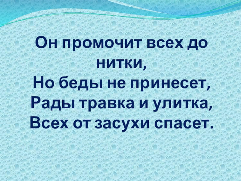 Слайд 35Он промочит всех до нитки, Но беды не принесет, Рады травка и улитка, Всех