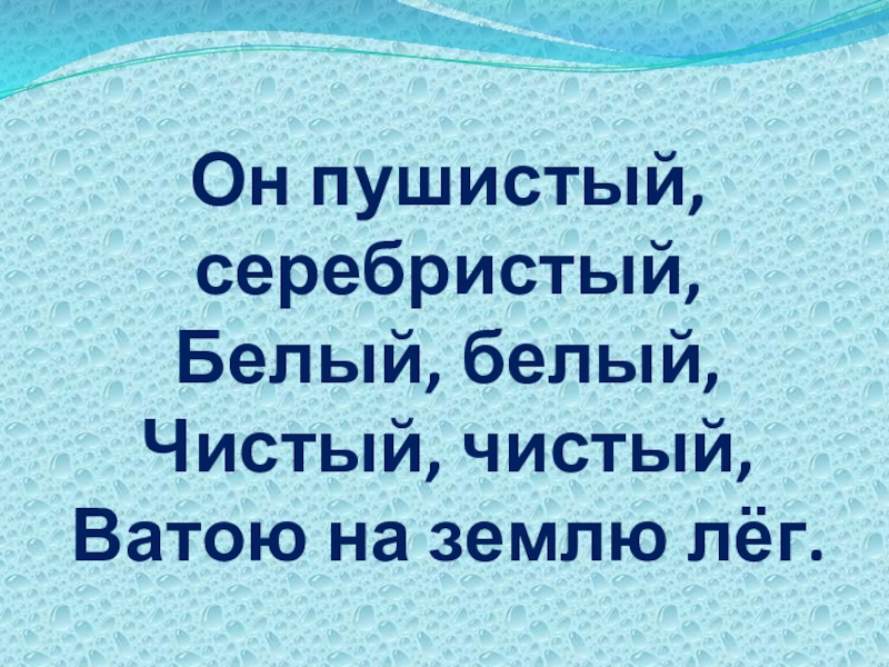 Слайд 23Он пушистый, серебристый,  Белый, белый,  Чистый, чистый,  Ватою на землю лёг.