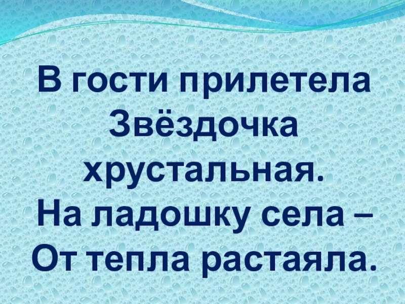 Слайд 17 В гости прилетела Звёздочка хрустальная. На ладошку села –  От тепла растаяла.