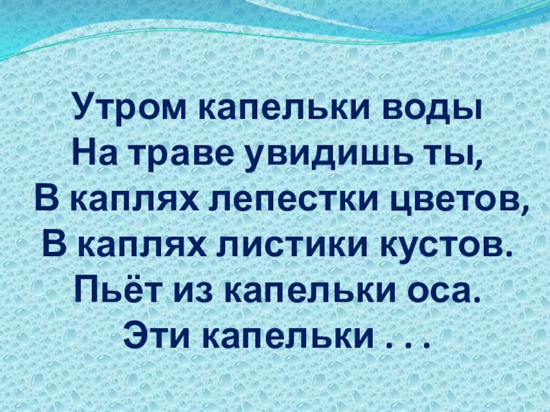 Утром капельки воды На траве увидишь ты, В каплях лепестки цветов, В каплях листики кустов. Пьёт из