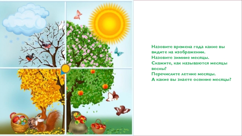 Назовите времена года какие вы видите на изображении.Назовите зимние месяцы. Скажите, как называются месяцы весны? Перечислите летние