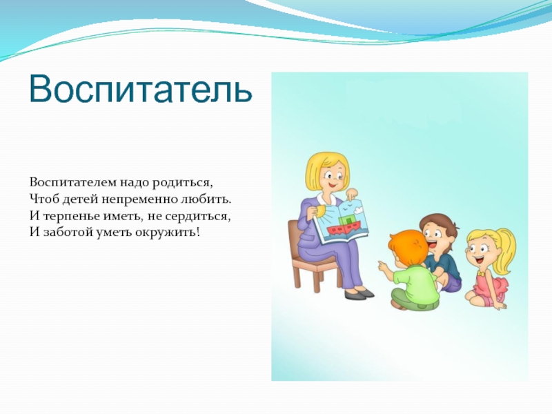 ВоспитательВоспитателем надо родиться, Чтоб детей непременно любить. И терпенье иметь, не сердиться, И заботой уметь окружить!