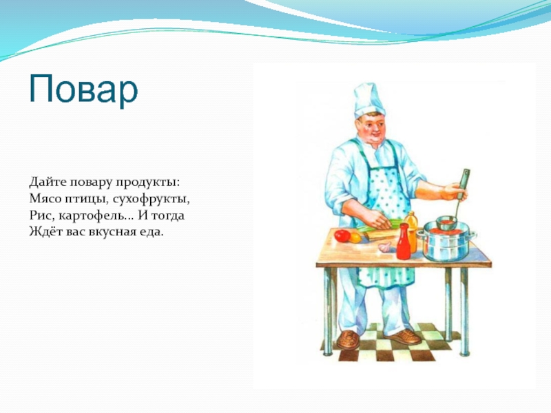 ПоварДайте повару продукты: Мясо птицы, сухофрукты, Рис, картофель… И тогда Ждёт вас вкусная еда.