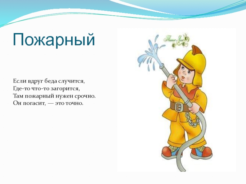 ПожарныйЕсли вдруг беда случится, Где-то что-то загорится, Там пожарный нужен срочно. Он погасит, — это точно.