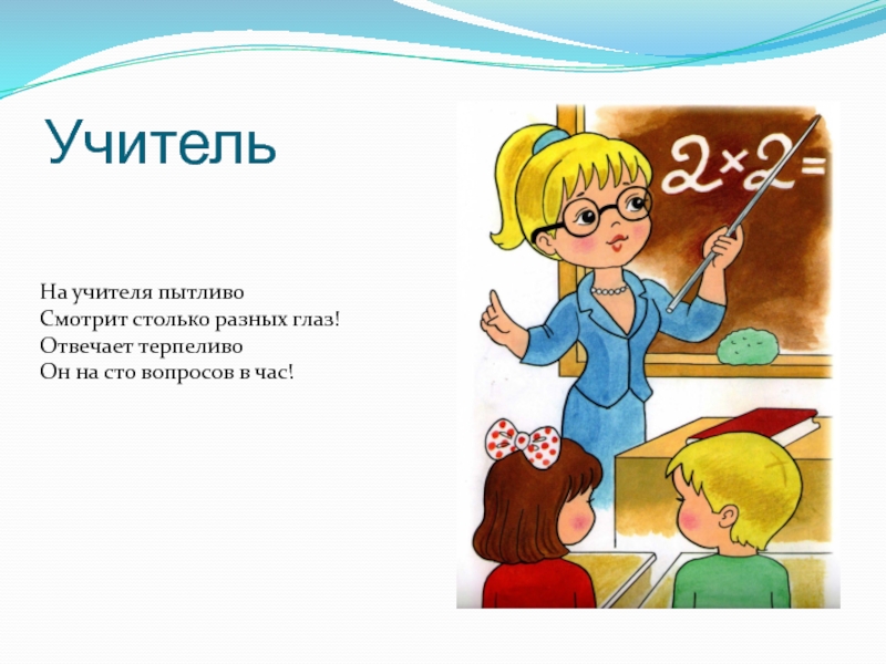 УчительНа учителя пытливо Смотрит столько разных глаз! Отвечает терпеливо Он на сто вопросов в час!