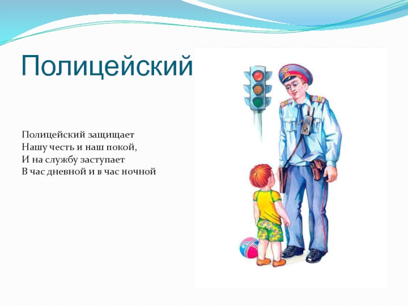 ПолицейскийПолицейский защищаетНашу честь и наш покой,И на службу заступаетВ час дневной и в час ночной