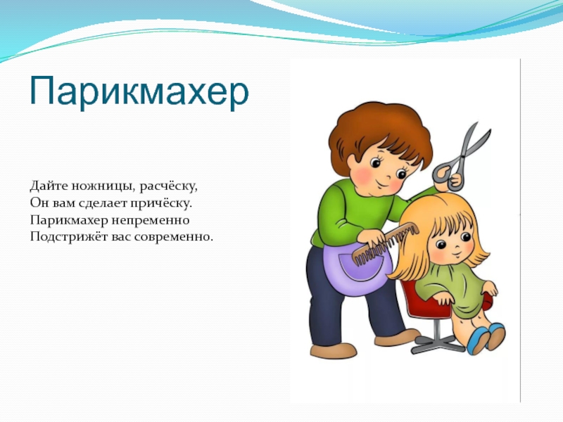 ПарикмахерДайте ножницы, расчёску, Он вам сделает причёску. Парикмахер непременно Подстрижёт вас современно.