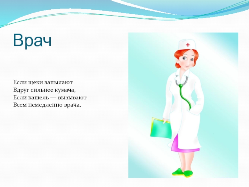 ВрачЕсли щеки запылают Вдруг сильнее кумача, Если кашель — вызывают Всем немедленно врача.