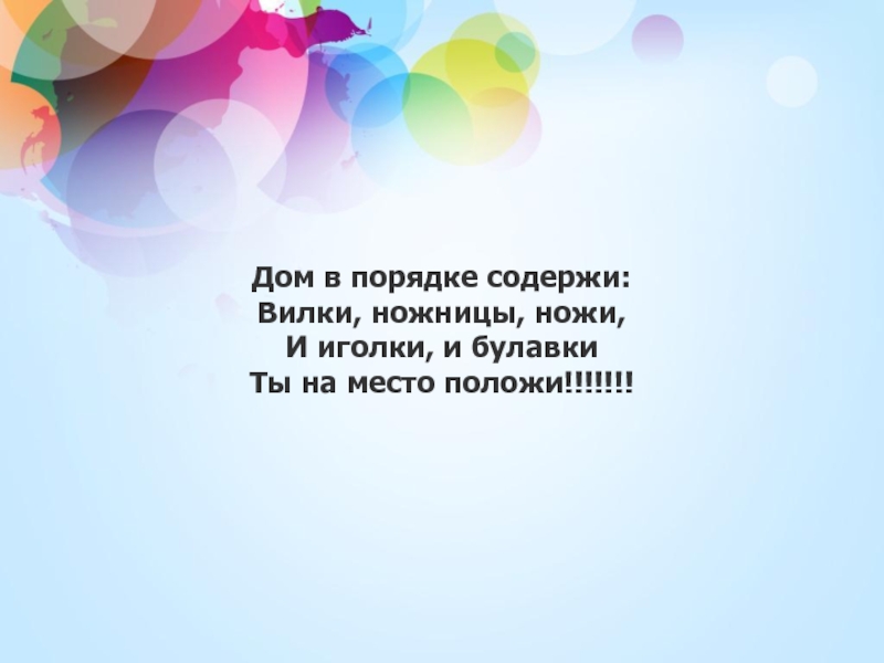 Дом в порядке содержи:  Вилки, ножницы, ножи, И иголки, и булавки Ты на место положи!!!!!!!