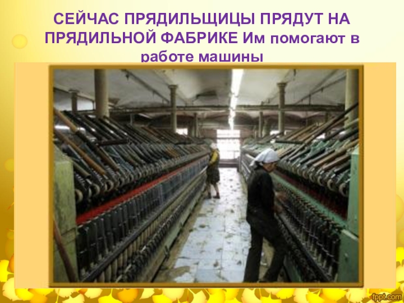 Слайд 10СЕЙЧАС ПРЯДИЛЬЩИЦЫ ПРЯДУТ НА ПРЯДИЛЬНОЙ ФАБРИКЕ Им помогают в работе машины