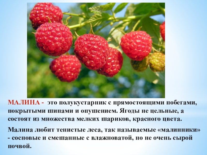 Малина любит тенистые леса, так называемые «малинники» - сосновые и смешанные с влажноватой, но не очень сырой почвой.
