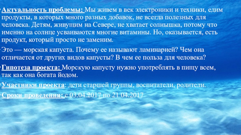 Гипотеза проекта: Морскую капусту нужно употреблять в пищу всем, так как она богата йодом.