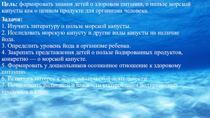 Слайд 3Цель: формировать знания детей о здоровом питании, о пользе морской капусты