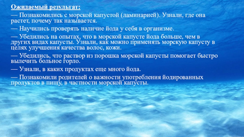 — Убедились на опытах, что в морской капусте йода больше, чем в других видах капусты. Узнали, как можно применять морскую капусту в целях улучшения качества волос, кожи.