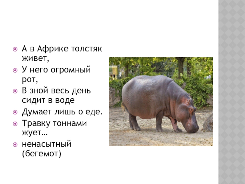 А в Африке толстяк живет,У него огромный рот,В зной весь день сидит в водеДумает лишь о еде.Травку