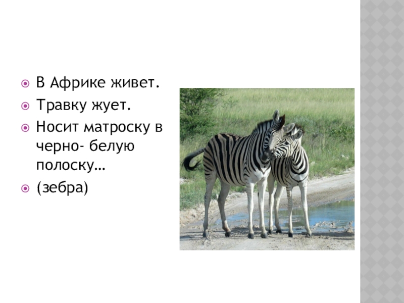 В Африке живет. Травку жует.Носит матроску в черно- белую полоску…(зебра)