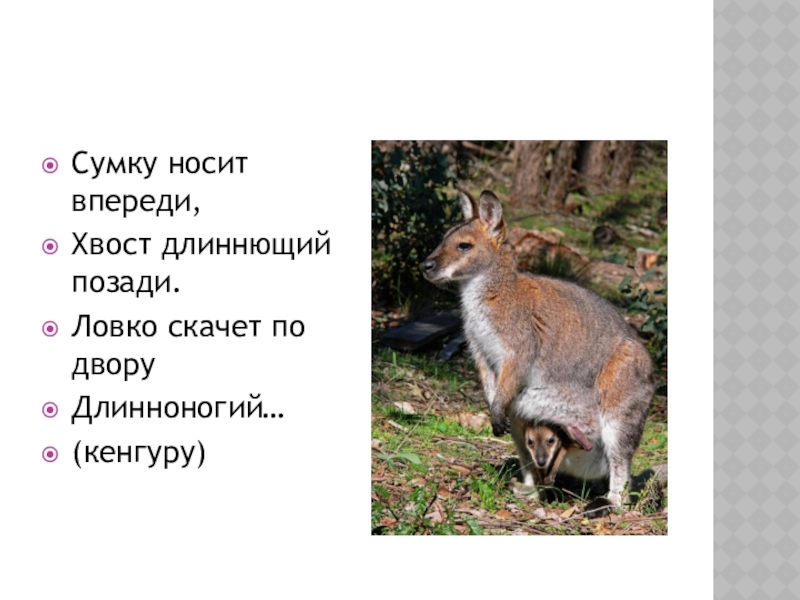 Сумку носит впереди,Хвост длиннющий позади.Ловко скачет по дворуДлинноногий…(кенгуру)