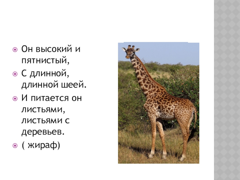 Он высокий и пятнистый,С длинной, длинной шеей.И питается он листьями, листьями с деревьев. ( жираф)