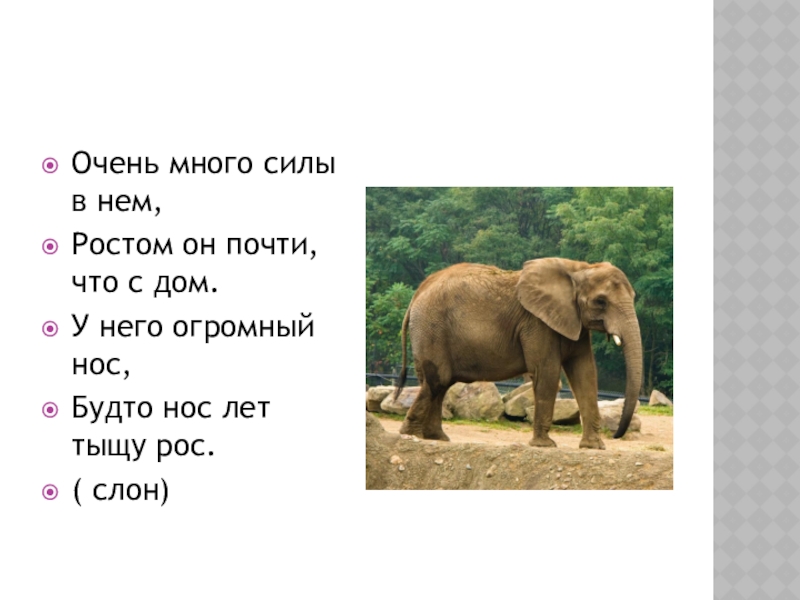 Очень много силы в нем,Ростом он почти, что с дом.У него огромный нос,Будто нос лет тыщу рос.(