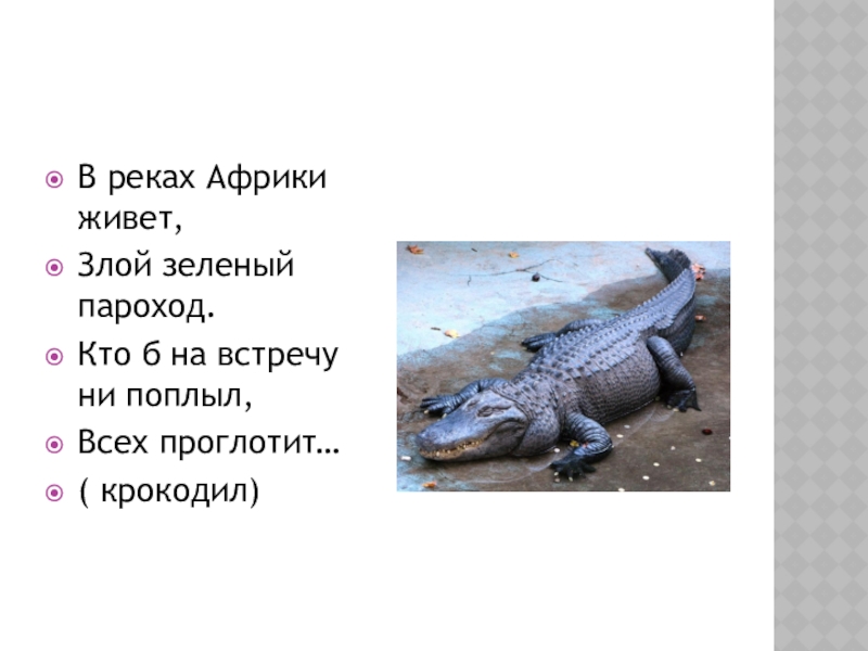 В реках Африки живет,Злой зеленый пароход.Кто б на встречу ни поплыл,Всех проглотит…( крокодил)