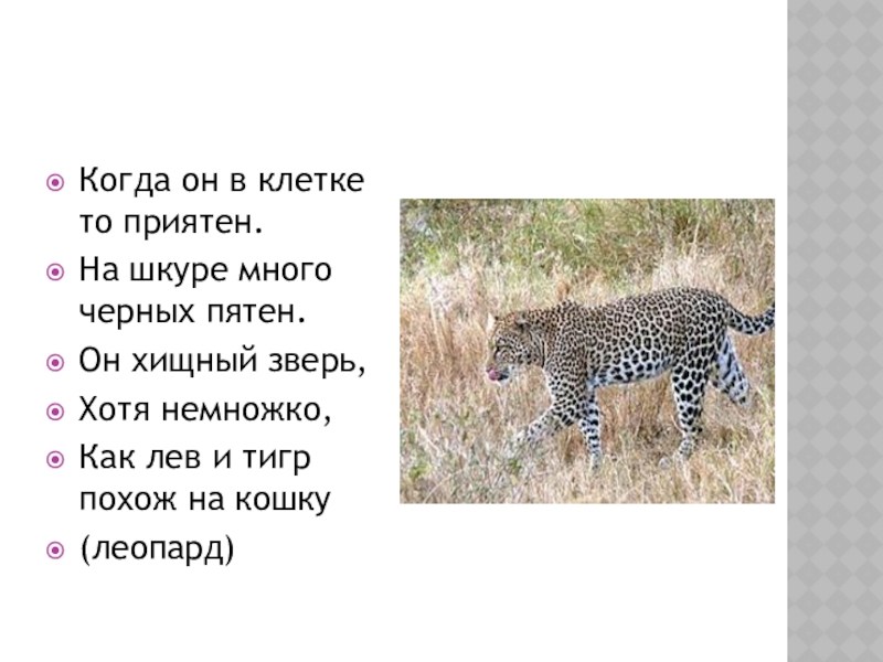 Когда он в клетке то приятен.На шкуре много черных пятен.Он хищный зверь,Хотя немножко,Как лев и тигр похож