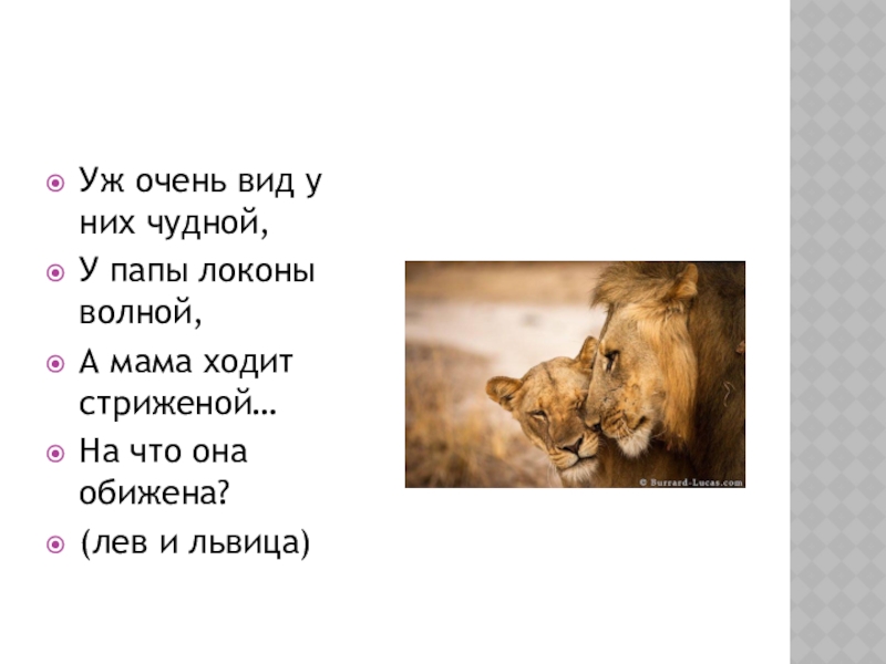 Уж очень вид у них чудной,У папы локоны волной,А мама ходит стриженой…На что она обижена?(лев и львица)