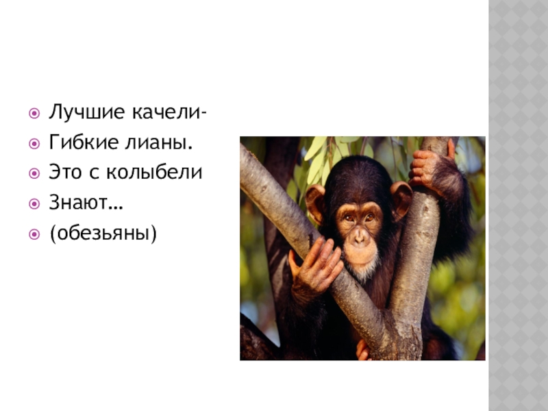 Лучшие качели-Гибкие лианы.Это с колыбелиЗнают…(обезьяны)