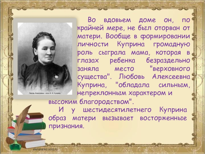 И у шестидесятилетнего Куприна образ матери вызывает восторженные признания.