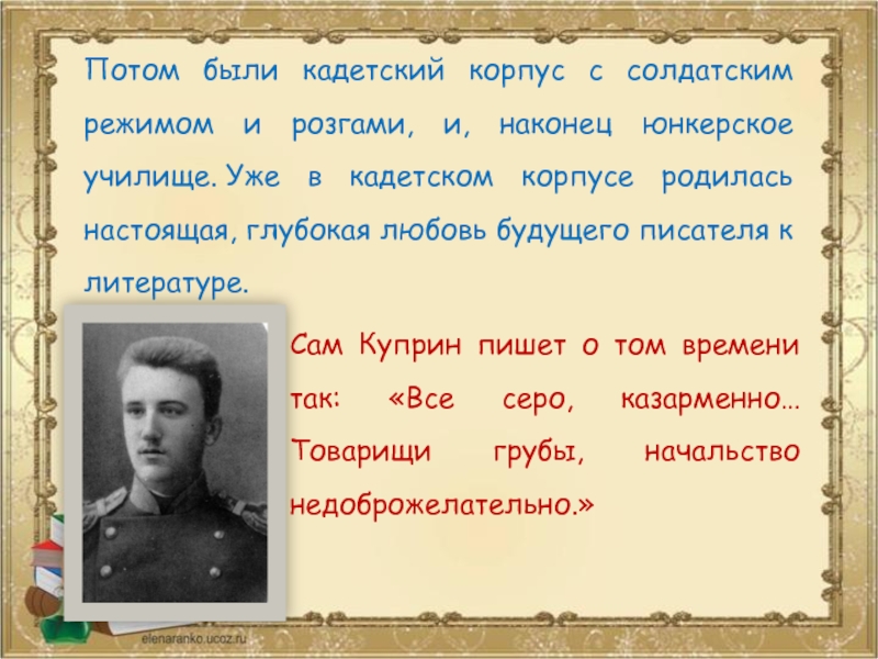 Сам Куприн пишет о том времени так: «Все серо, казарменно… Товарищи грубы, начальство недоброжелательно.»