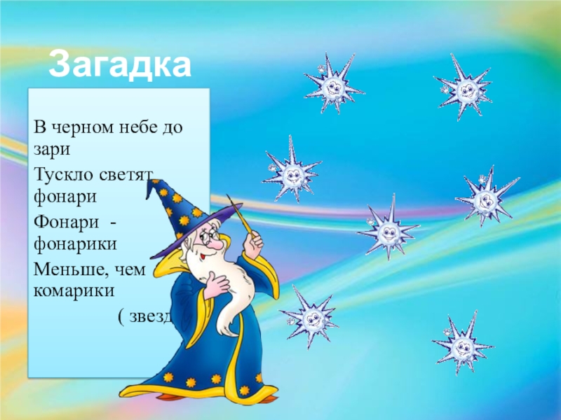 ЗагадкаВ черном небе до зариТускло светят фонариФонари - фонарикиМеньше, чем комарики			( звезды )