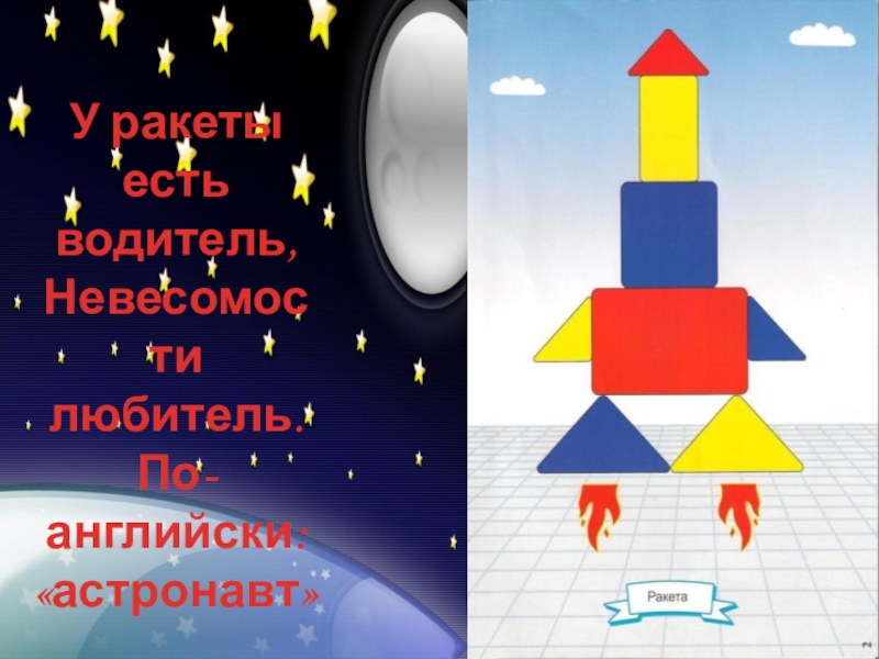 У ракеты есть водитель, Невесомости любитель. По-английски: «астронавт», А по-русски … (Космонавт)