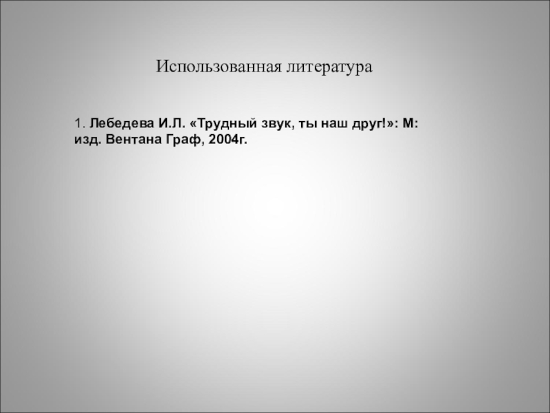 Использованная литература1. Лебедева И.Л. «Трудный звук, ты наш друг!»: М: изд. Вентана Граф, 2004г.