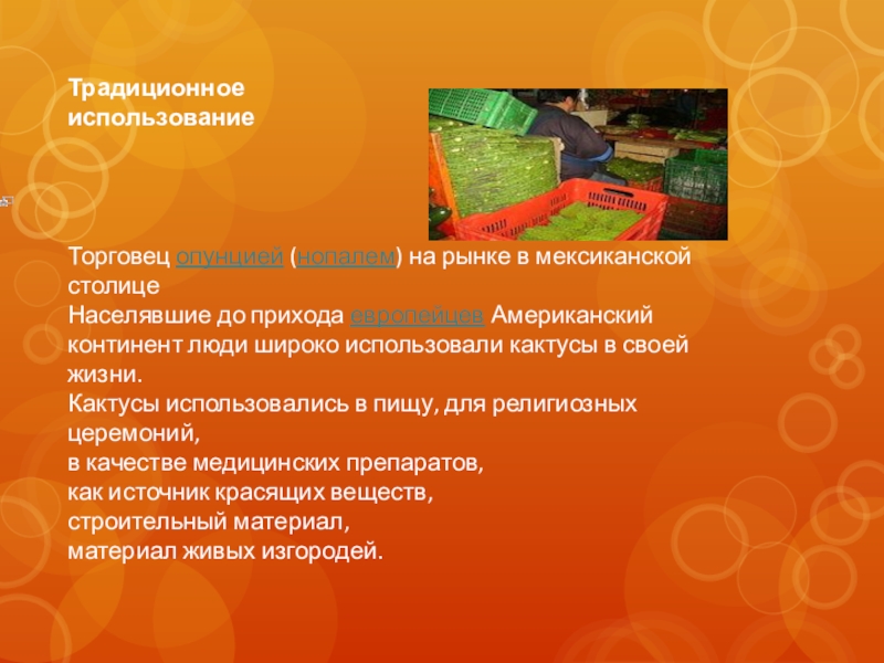Традиционное использование Торговец опунцией (нопалем) на рынке в мексиканской столицеНаселявшие до прихода европейцев Американский континент люди широко