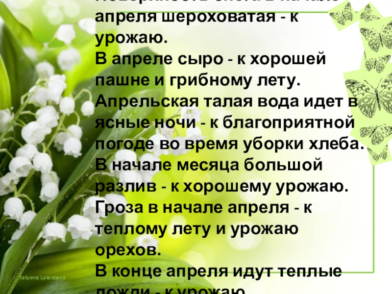 Слайд 10Поверхность снега в начале апреля шероховатая - к урожаю.