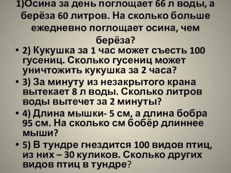 5) В тундре гнездится 100 видов птиц, из них – 30 куликов. Сколько других видов птиц в тундре?