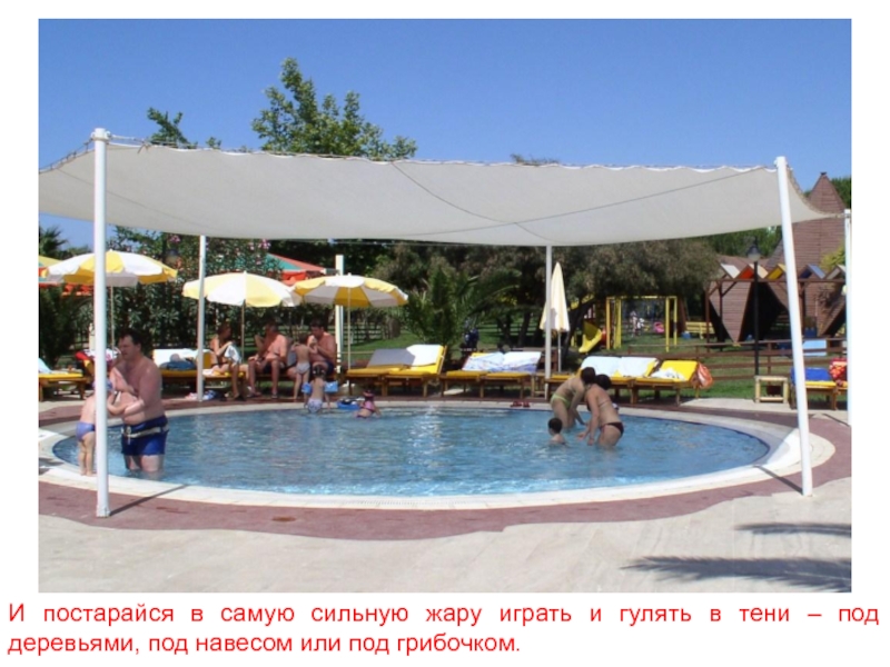 Слайд 6И постарайся в самую сильную жару играть и гулять в тени