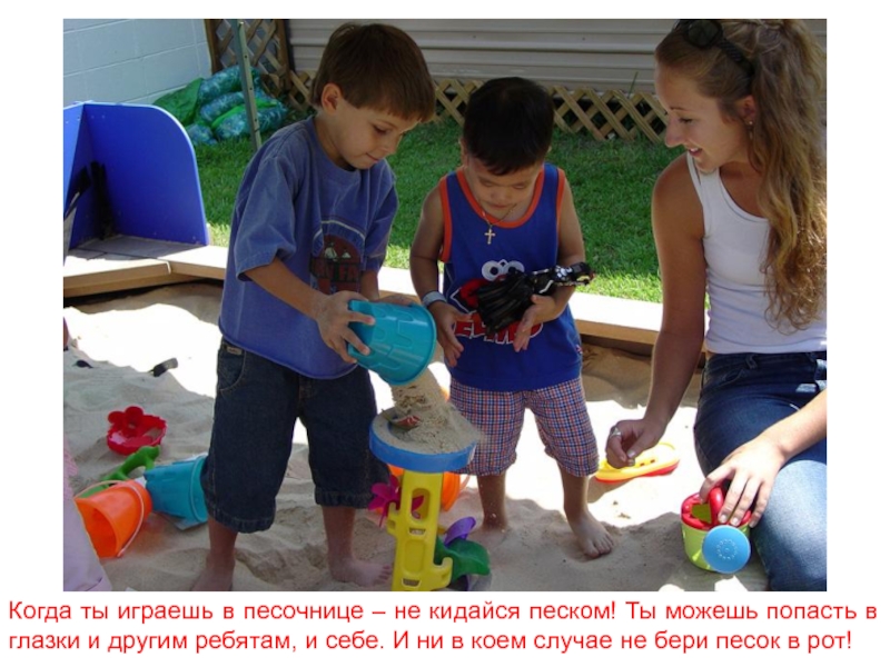 Слайд 15Когда ты играешь в песочнице – не кидайся песком! Ты можешь